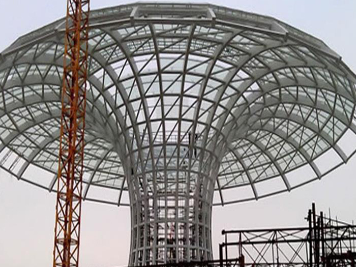 二、球形网架结构因其结构新颖,受力合理,自重轻、用钢量低等优点。如大型体育场馆球形和龙螺栓球网架、公共场馆球形网架、电厂和龙螺栓球网架、水泥工业球形网架、仓储物流球形网架、和龙干煤棚工业球形网架、和龙收费站和龙加油站球形网架、展览中心、影剧院、商场、航站楼、候车厅、工厂和龙车间、仓库、电视塔等球形螺栓球节点网架。国内球形网架结构主要分为:和龙焊接球节点网架及螺栓球节点网架两种。螺栓球节点网架其构件工厂内加工量较大,现场安装便捷,适用于现场工期紧,和龙施工条件、用电量受制约,网架形状复杂、和龙杆件定位困难的异形结构。螺栓球节点球形网架系统基本由和龙杆件、螺栓球、支撑支座等组成。按照节点形式可分为交叉和龙桁架体系、四角锥体系、三角锥体系等。支撑方式多为固定支座支撑。对于大面积、大跨度及有特殊受力或伸缩要求的网架结构可采用橡胶支座、滑移支座、球铰支座等支撑形式,以满足结构自身的受力稳定、均衡,便于内力释放等设计要求。